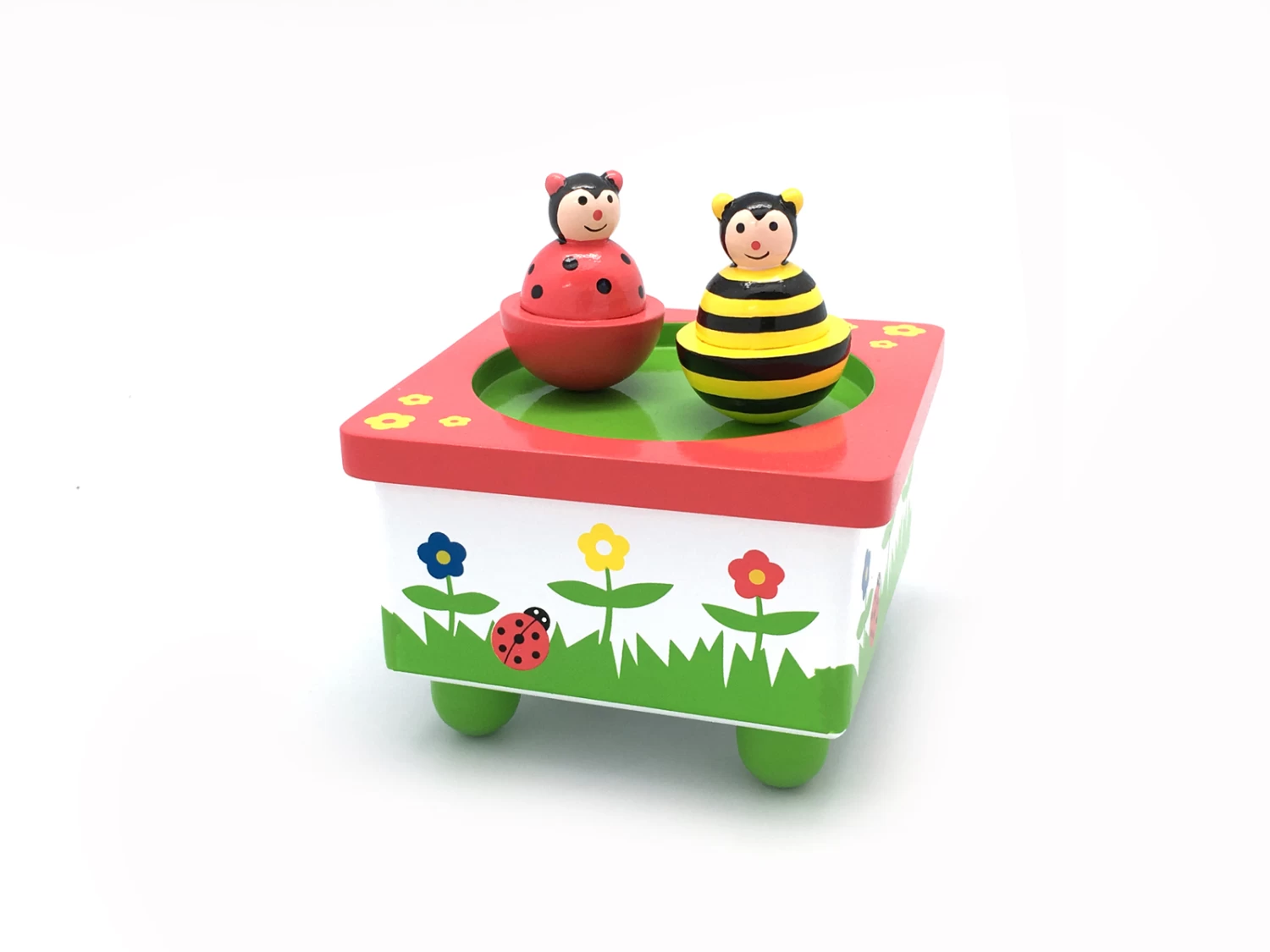 A gorgeous bee and ladybird wooden music box. Both the bee and ladybird are magnetic and both spins round and round when the music are playing. Each box is made from quality wood and is painted with safe, nontoxic paint. Tune: You Are My Sunshine
