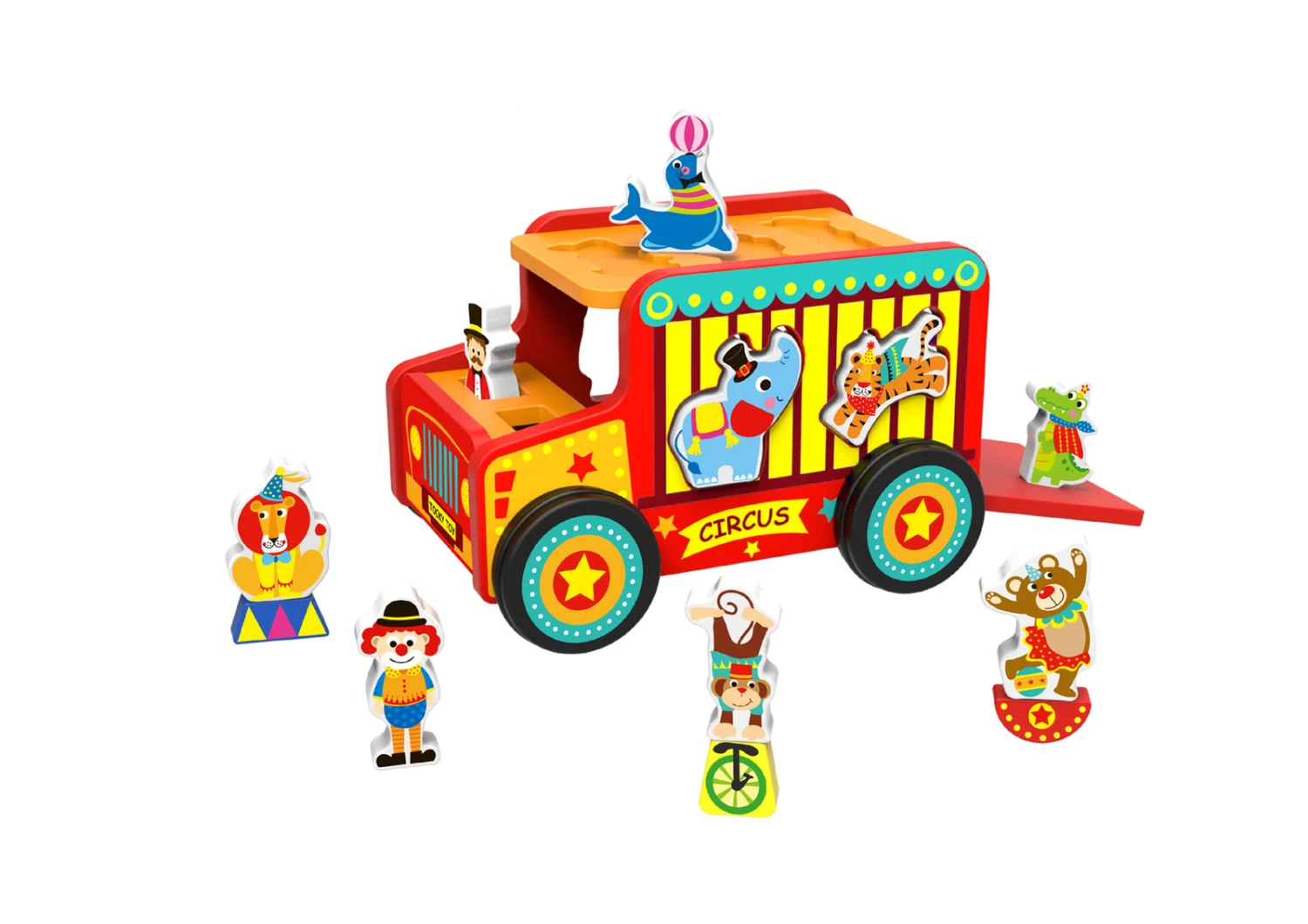 A bright and vibrant wooden Safari bus. Painted with bright non-toxic paint. Comes complete with circus animals and animal shaped windows. The animals can be push through the shape sorting bus. Promotes problem solving and coordination skills. It is beautifully box, so it is great for gifts.