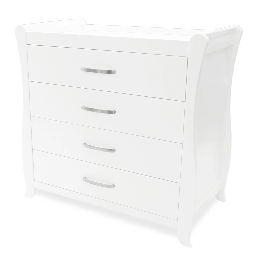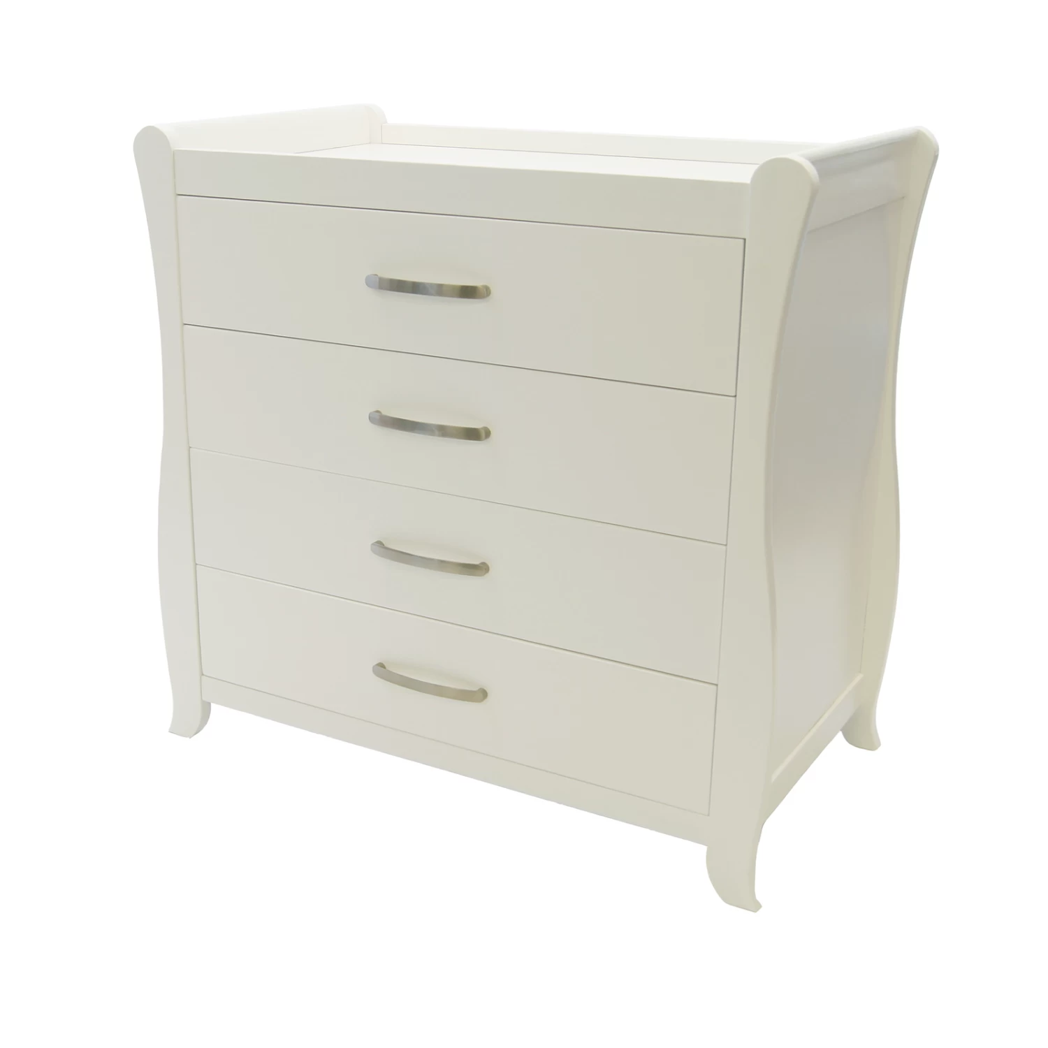 A solid and sturdy sleigh styled chest with smooth sliding 4 drawers to secure all your baby’s delicate clothes and keep your baby’s nursery organised and tidy. Designed with that little attention to detail that makes this chest truly a beautiful piece of furniture, which is compatible with any stylish curveous nursery.