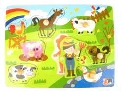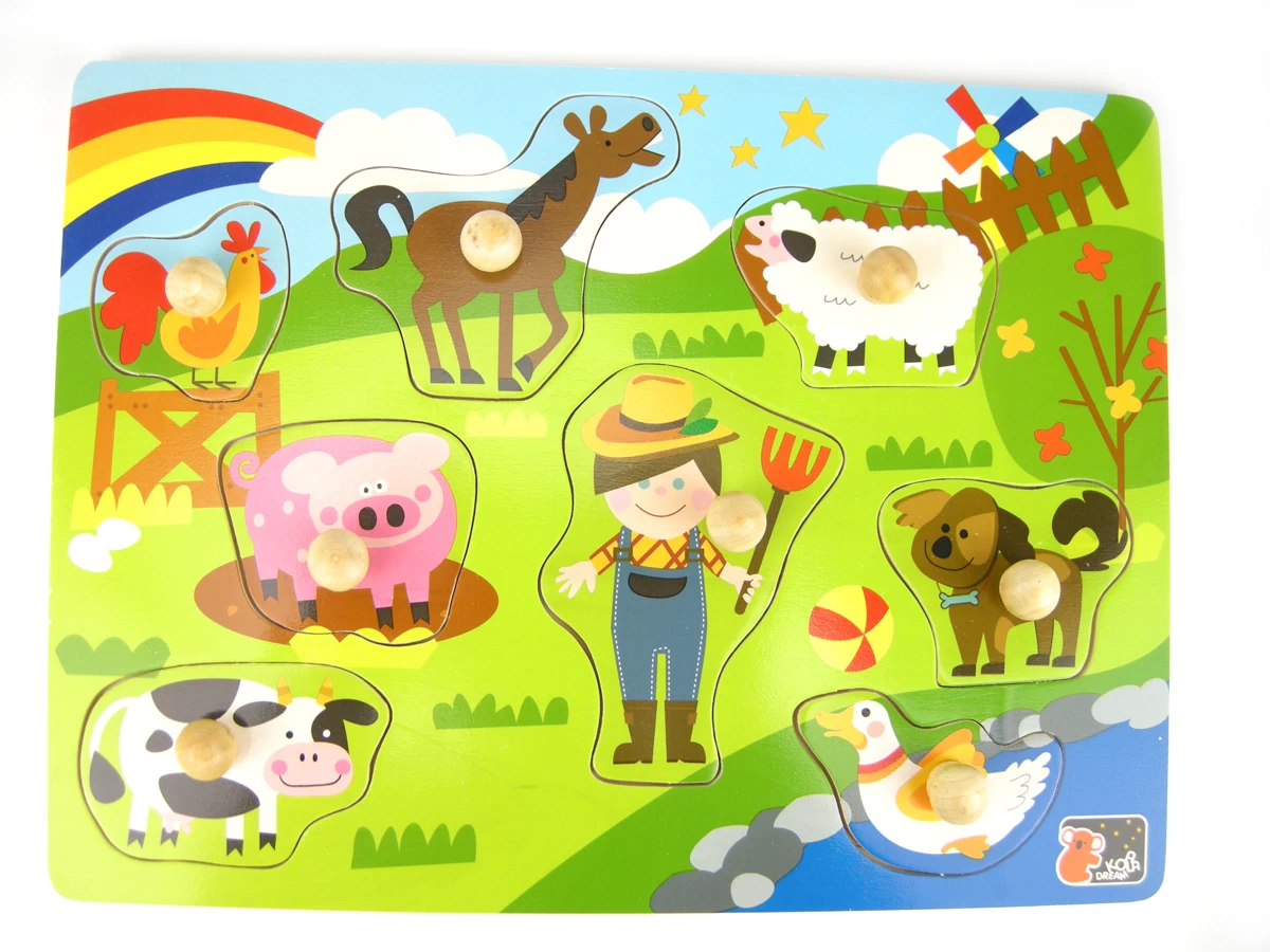 This is a lovely wooden puzzle with farm animals. Each pull out piece is attached to a wooden knob, making it esay for the little hands. This puzzle helps with improving fine motor skills and helps with identifing animals who lives on a farm.
