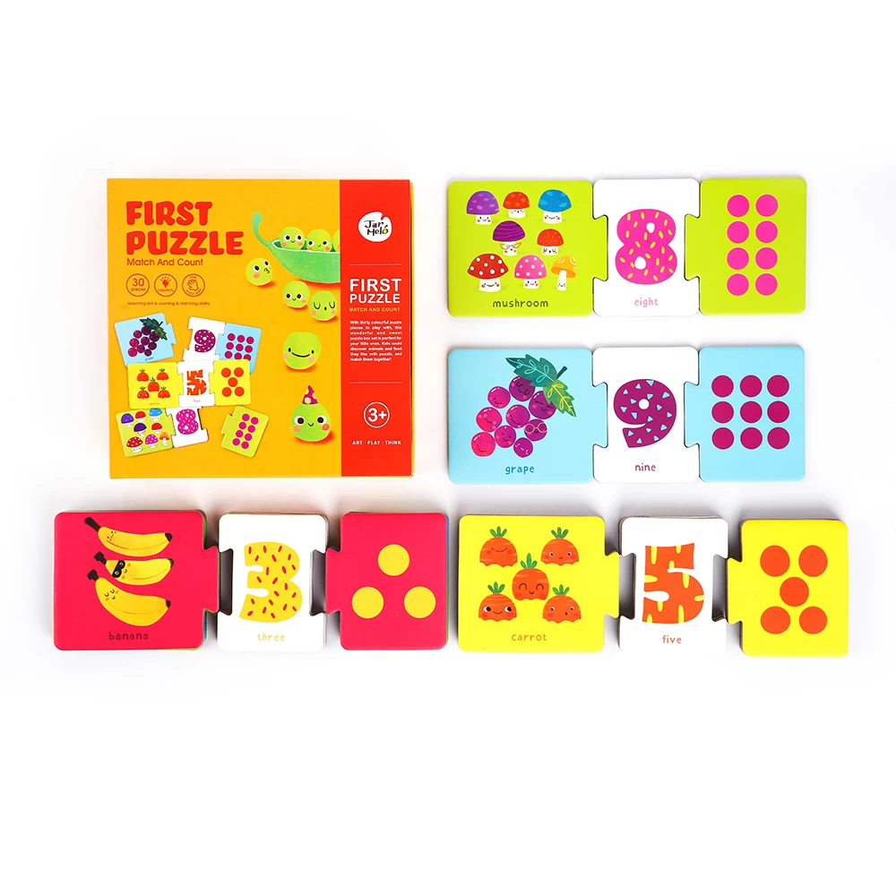 This is a beautiful first puzzle for your little one, in vibrant colours and easy to hold pieces. A puzzle where they learn to count and match simple pictures. A great way to promote communication and fine motor skills.