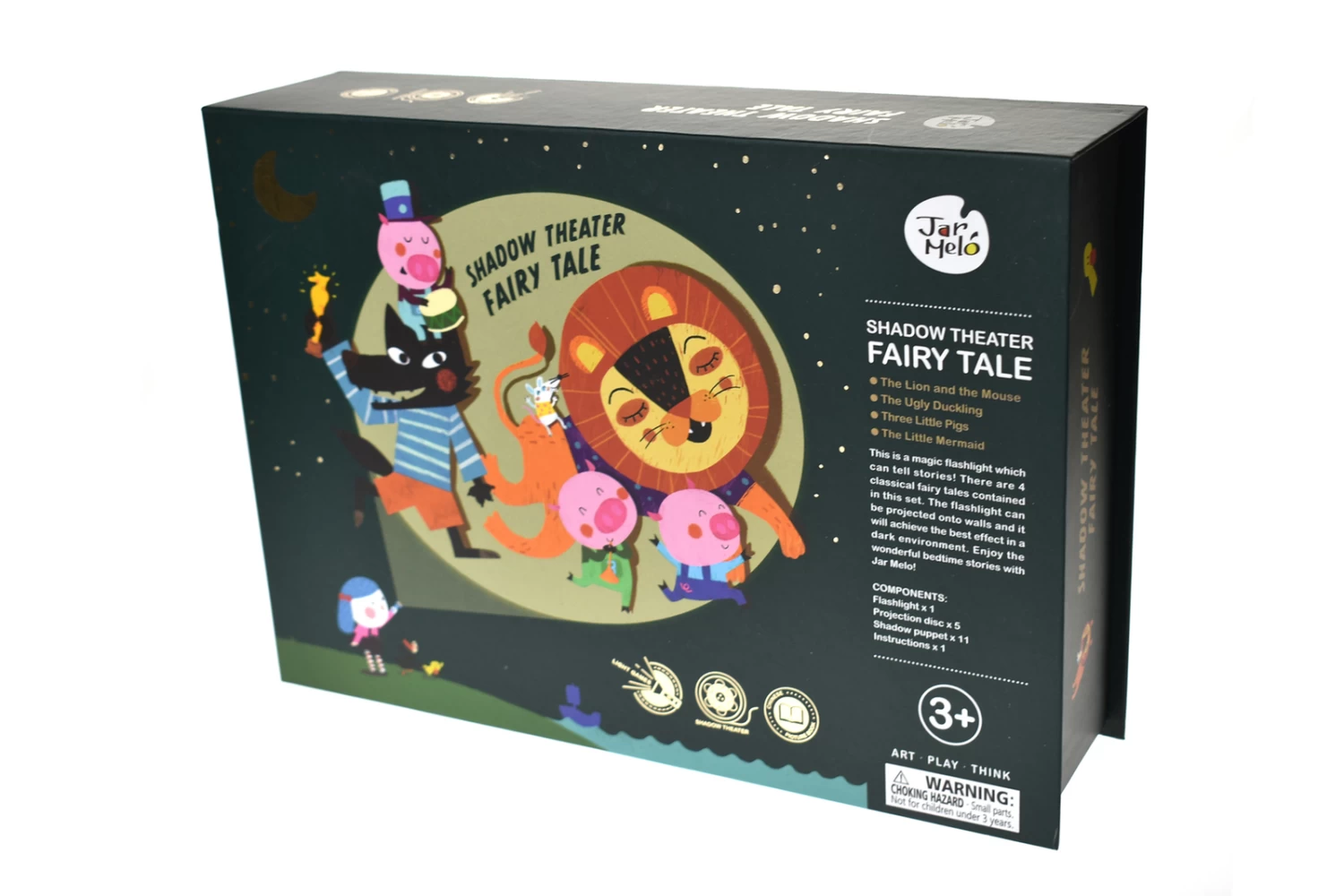 Delightful set with a flashlight projector, 4 story discs, 1 shadow puppet disc, picture story book and 11 shadow puppets all packed in a beautiful gift box case that converts to a theatre set. Great bedtime fun promotes imagination and communication skills.