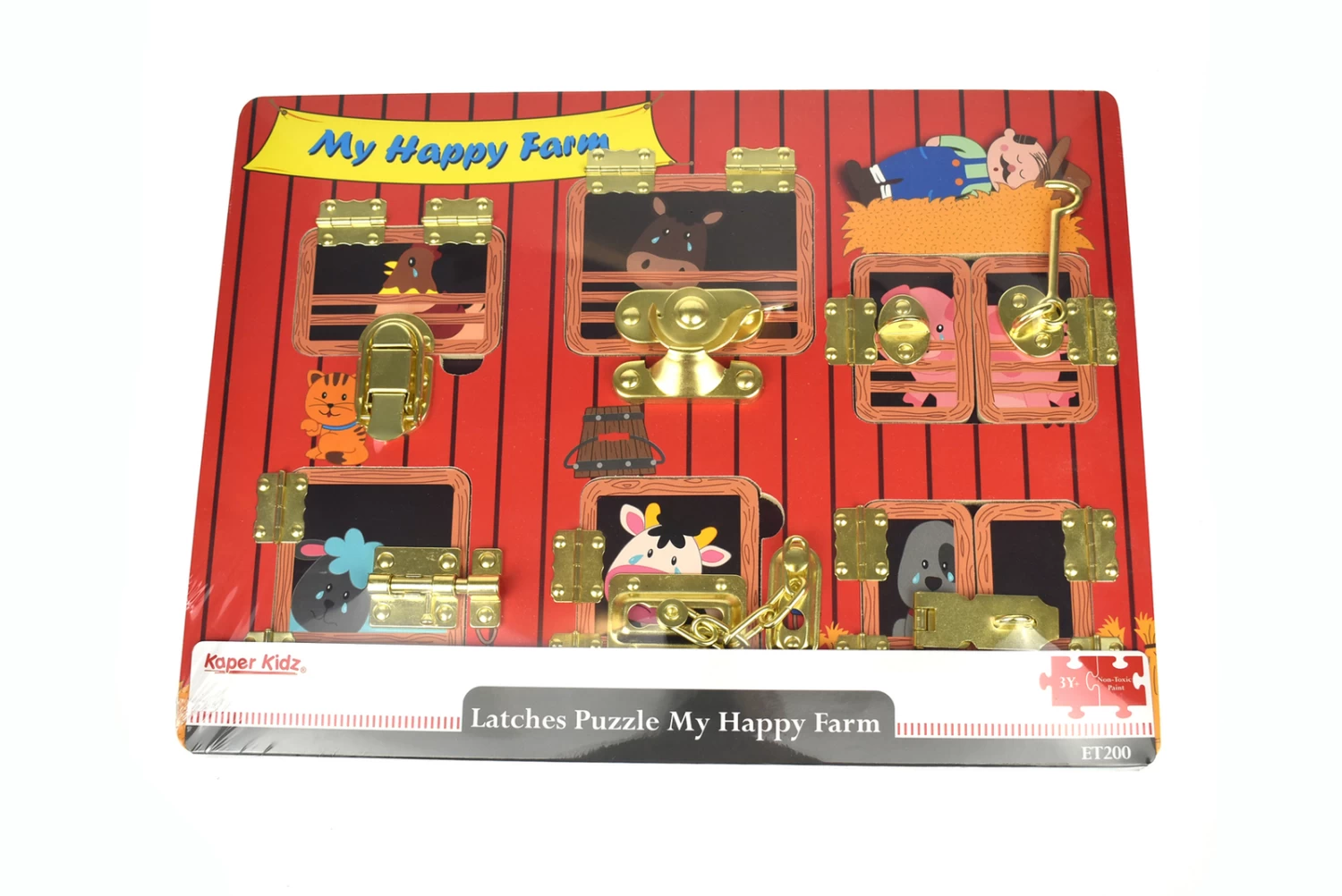 This Is a well-designed and made wooden puzzle board. The objective of this design is to help young children with fine motor skills and problem-solving skills as they try to work out the mechanics of the latches. There are 6 different doors and latches to be opened. Each door has a farm animal printed on and underneath a puzzle piece of baby animal. This puzzle can also help children understand the concept of adult/child and the concept of lost as the puzzle pieces underneath can be taken out the door. This puzzle encourages adult involvement as they need to take the puzzle pieces out for the child to put back in the correct place.
