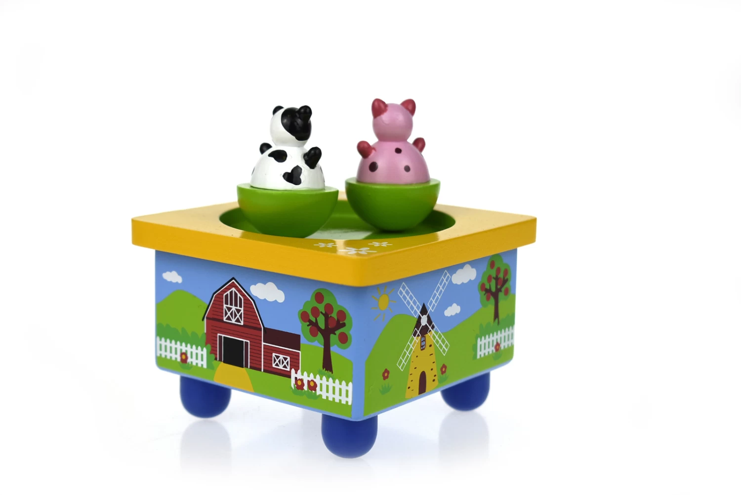A gorgeous farm wooden music box. The farm animals are magnetic and spins around and around when the music is playing. Each box is made from quality wood and is painted with safe, nontoxic paint Tune: Old MacDonald Had a Farm.