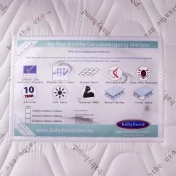 The babyhood My First Breathe Eze Innerspring Mattress is designed to provide your baby with optimum support for their delicate body and great breathability through the 100% cotton cover and breathable vents keeping your baby more comfortable and safer, in a firmer innerspring mattress, that will last for years to come.