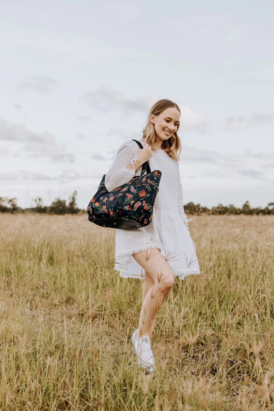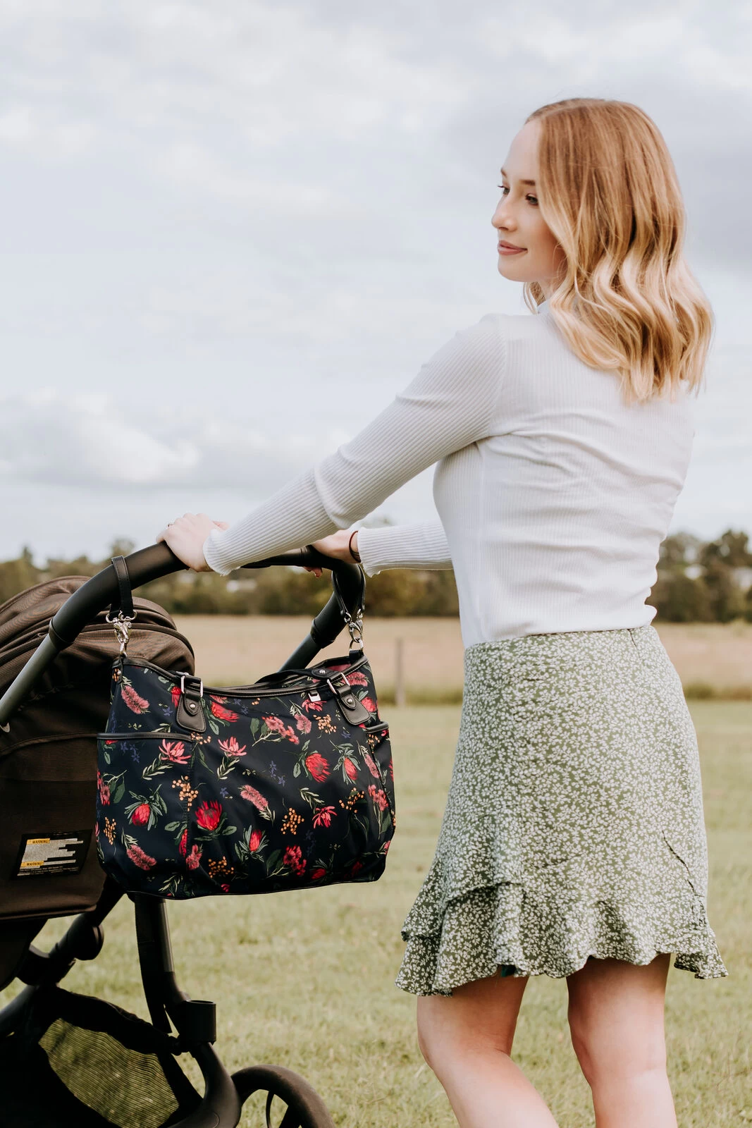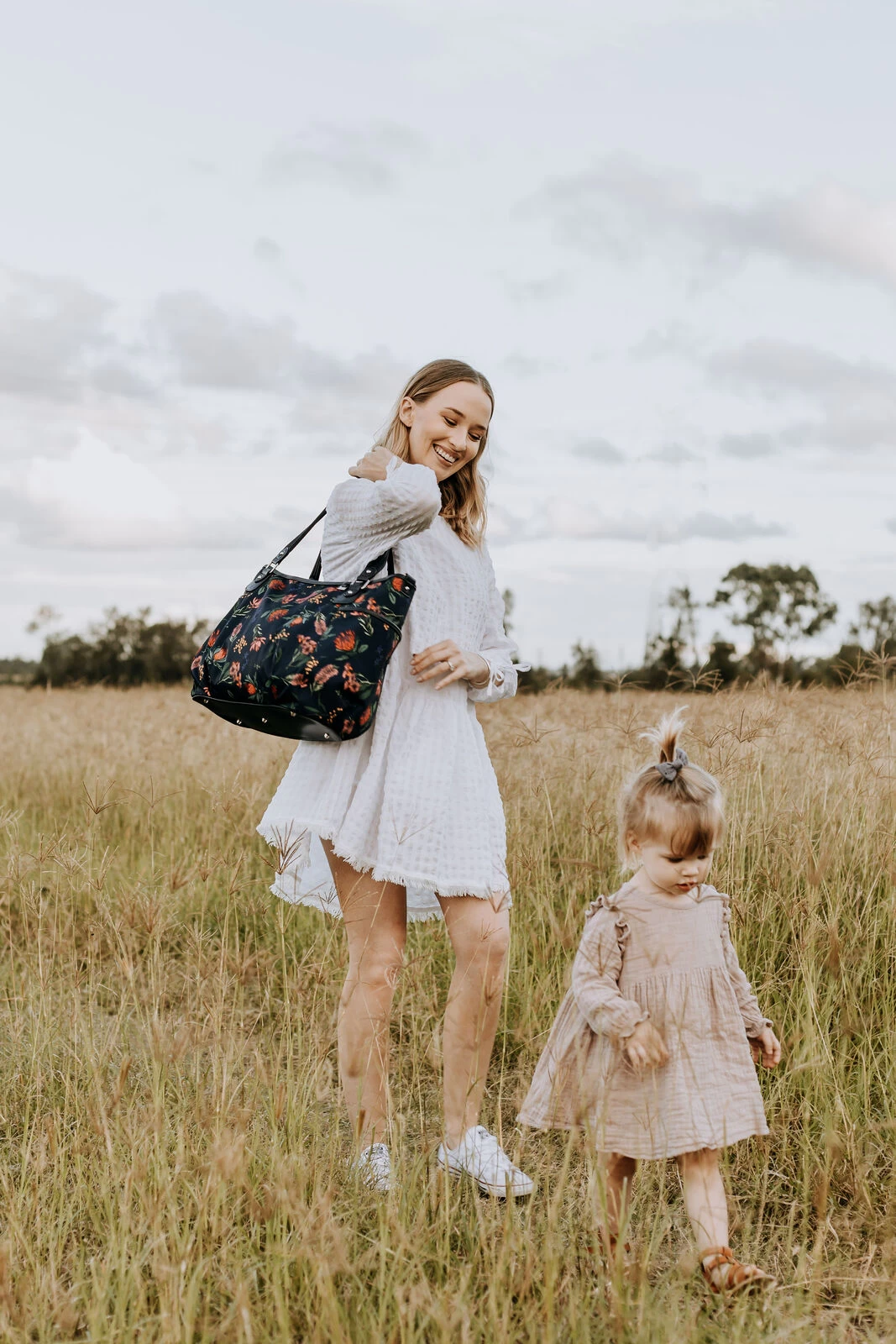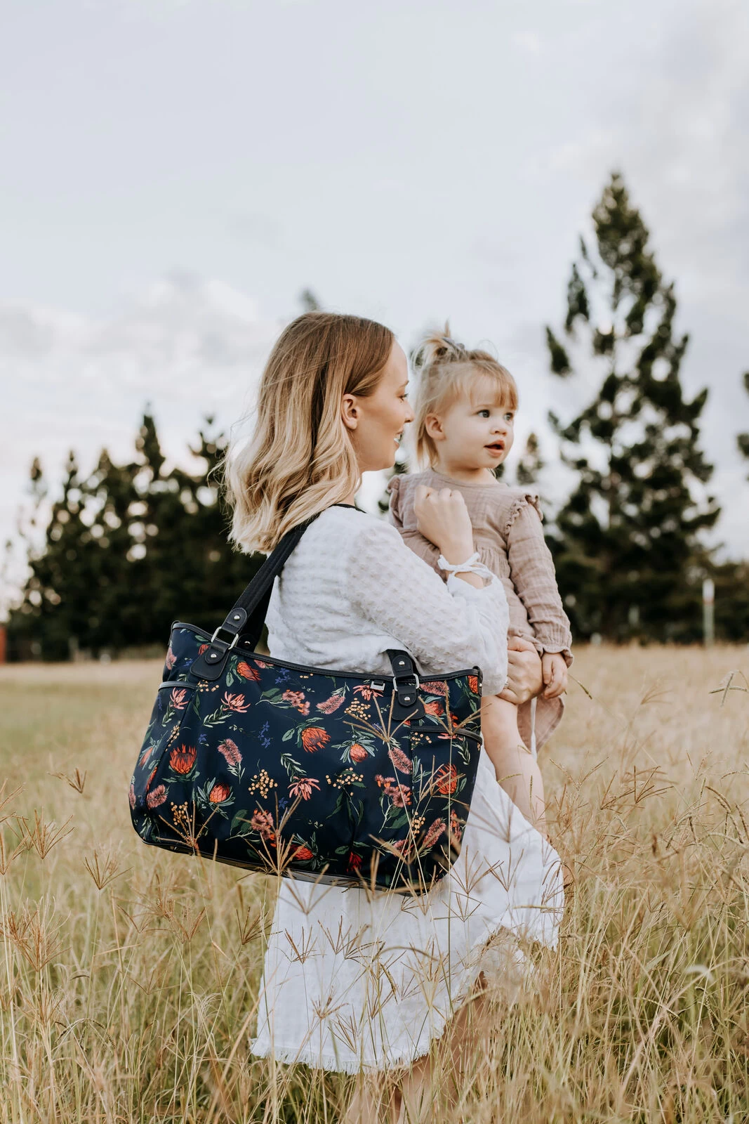 Botanical tote Navy ground includes Bottleholder, change mat, wet purse, stroller straps, long web shoulder strap. Water-resistant finish.