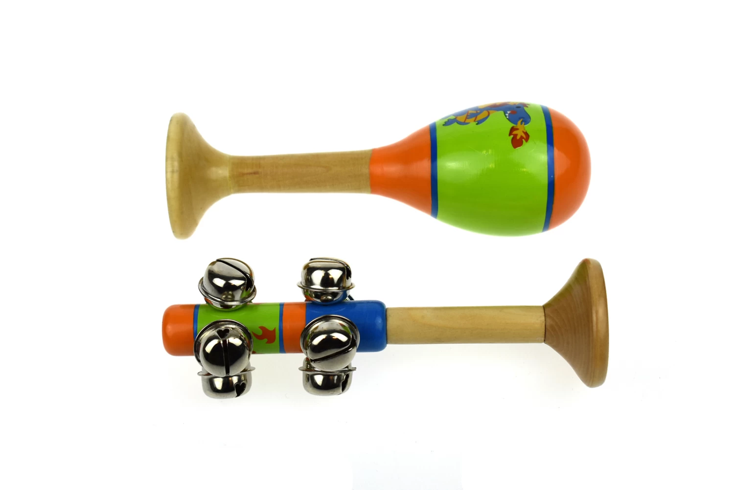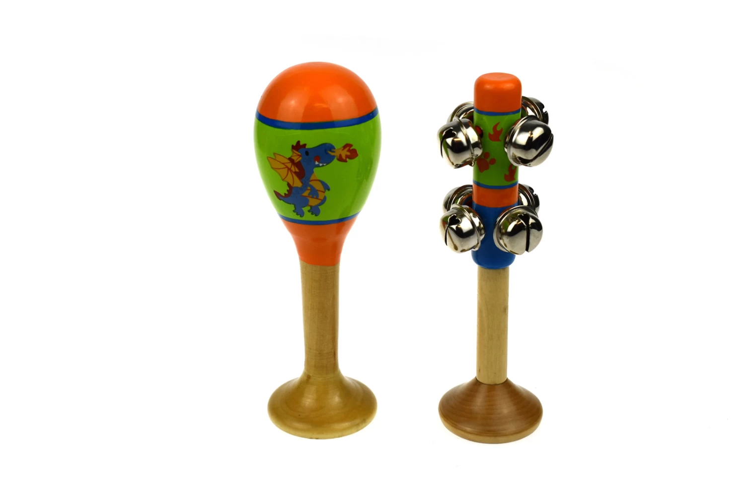 A beautiful dragon themed maraca and bell stick with a lovely ring. Each one has a base made so it can stand straight and prevent children from putting it in their mouth. Made of good quality wood and painted with non toxic paint. Complete with one maraca and one bell stick per pack. Music helps strengthen memory skills