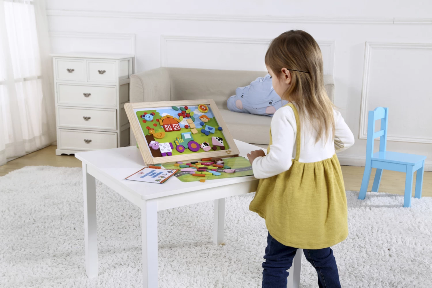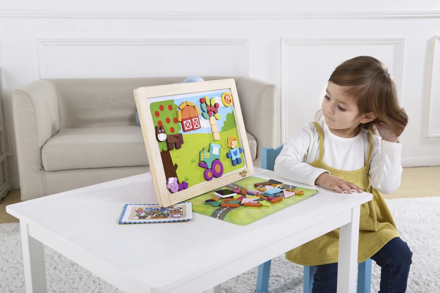 Timber framed magnetic whiteboard complete with loads of geometric magnetic shapes and farm scenery components, whiteboard markers with built-in erasers and interchangeable background cards to provide changing settings to stimulate creativity. Children learn shapes and colors as they play. This set also stimulates role play and storytelling.