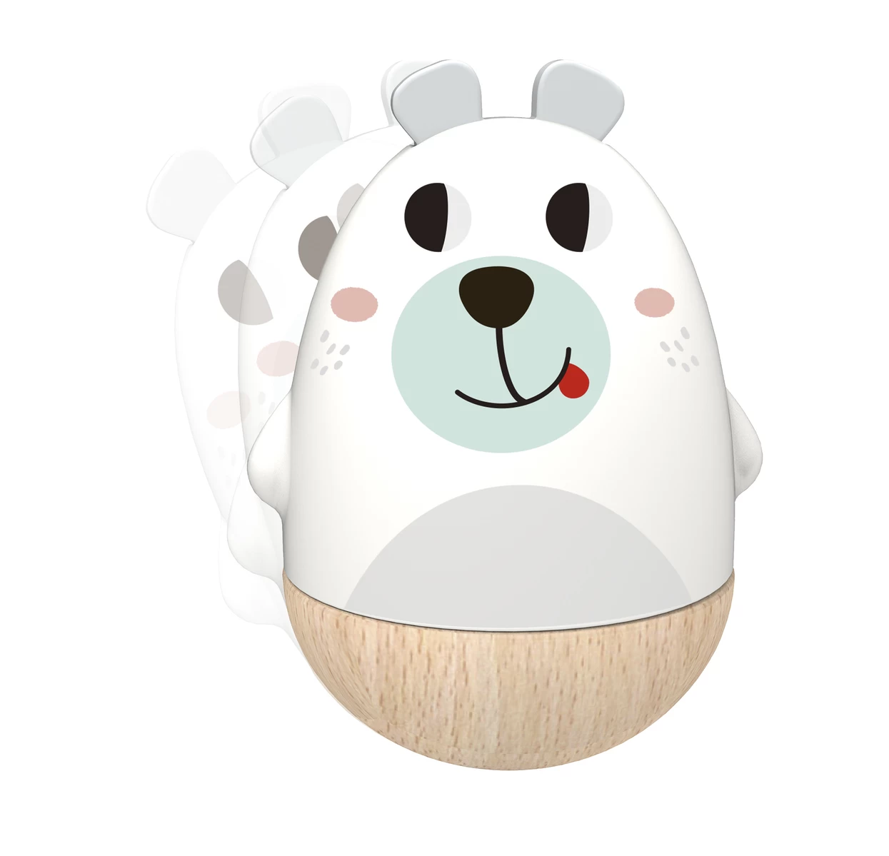 Adorable wooden bear tumble toy includes wind up music box. Young children love to play with topple toys. Wind the top around and set the music playing while baby plays with the toppling bear. Hours of fun.