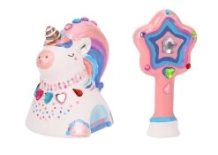 This kit comes with 6 pot paints and a brush to add some colour, plus a sheet of beautiful gems that you can use to decorate the unicorn. Kids will have hours of fun painting their own design, Finish product is fantastic. a perfect gift for a friend or find a spot in your room