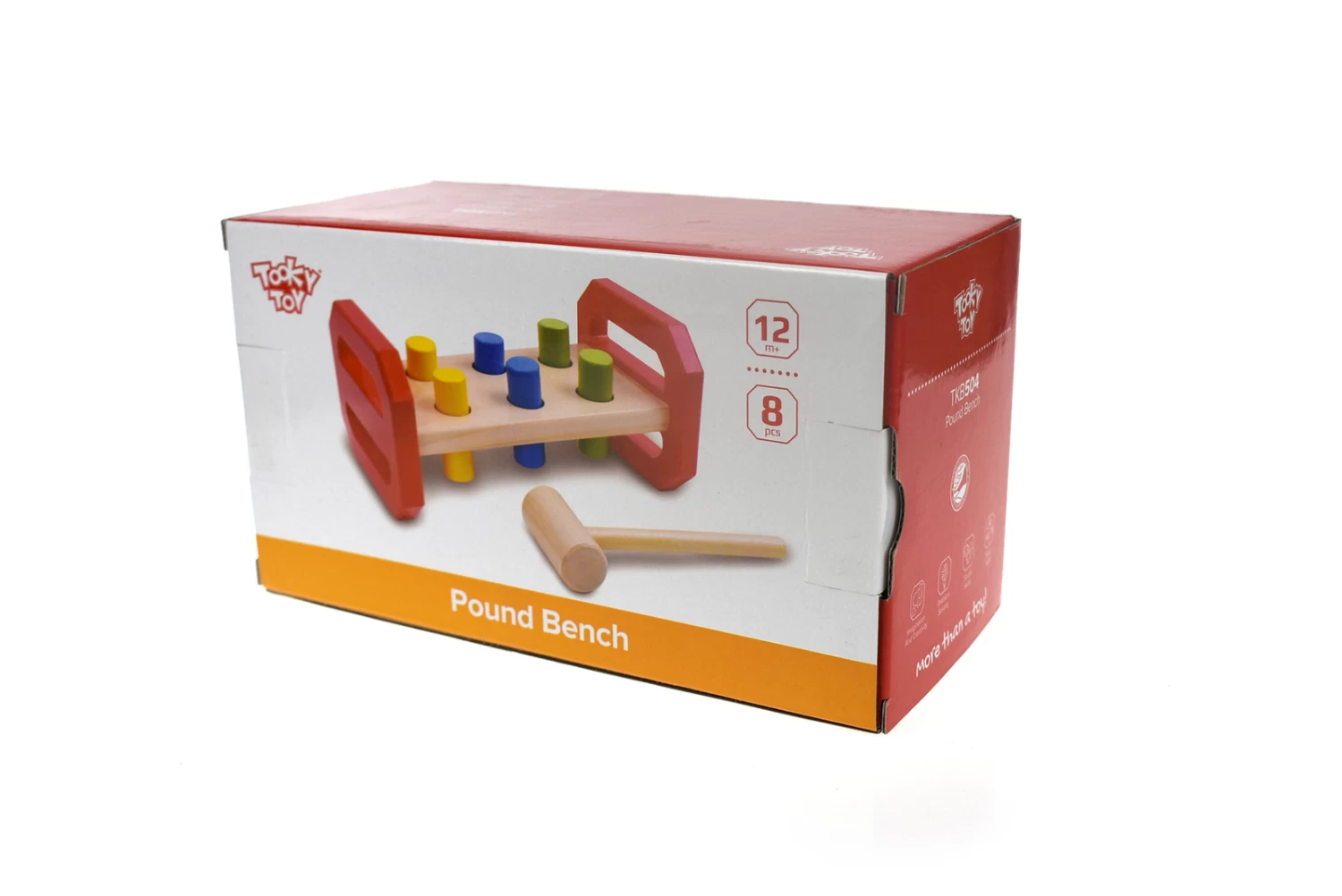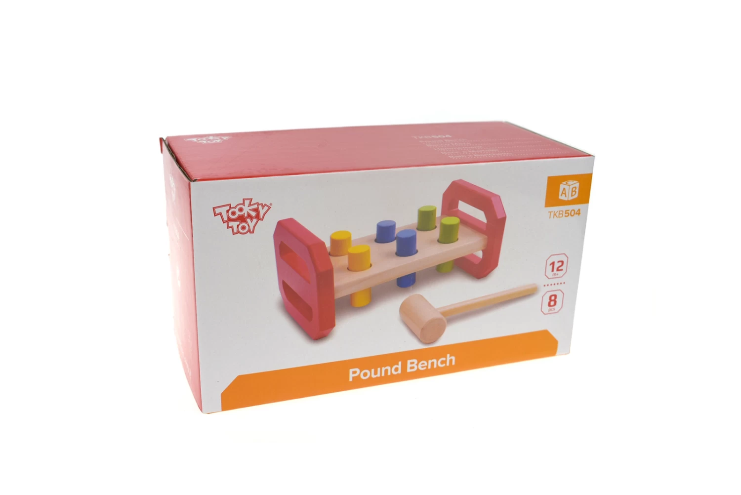 The hammer bench is a traditional toy that young ones will love. Tap with the mallet and the coloured pegs will go through the holes. Promotes fine motor skills, hand and eye coordination. Beautiful made and packaged. Paint used are nontoxic.